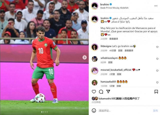 迪亚斯此役为摩洛哥首发出战,他在社交媒体上晒出比赛照片,配文:“为摩洛哥晋级世界杯感到无比欣喜,多么美妙的感觉!感谢大家的支持。”